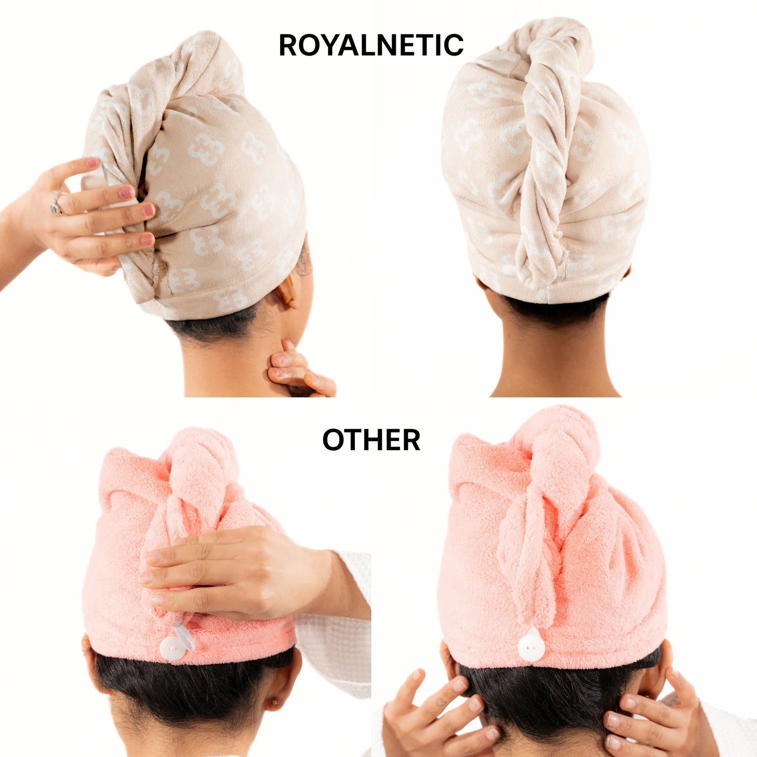 Our Magnet Hair Wrap changes everything with a revolutionary button-free magnetic closure design, we use Powerful yet gentle magnets that keeps your hair towel securely in place, making it effortless to fasten and remove, compared to traditional hair wraps that depend on unreliable elastic bands and buttons which Over time, these common components will stretch out, snap, or pop loose, causing constant replacements. Our innovative Magnet Hair Wrap eliminates these issues entirely making it perfect for daily use, day after day.